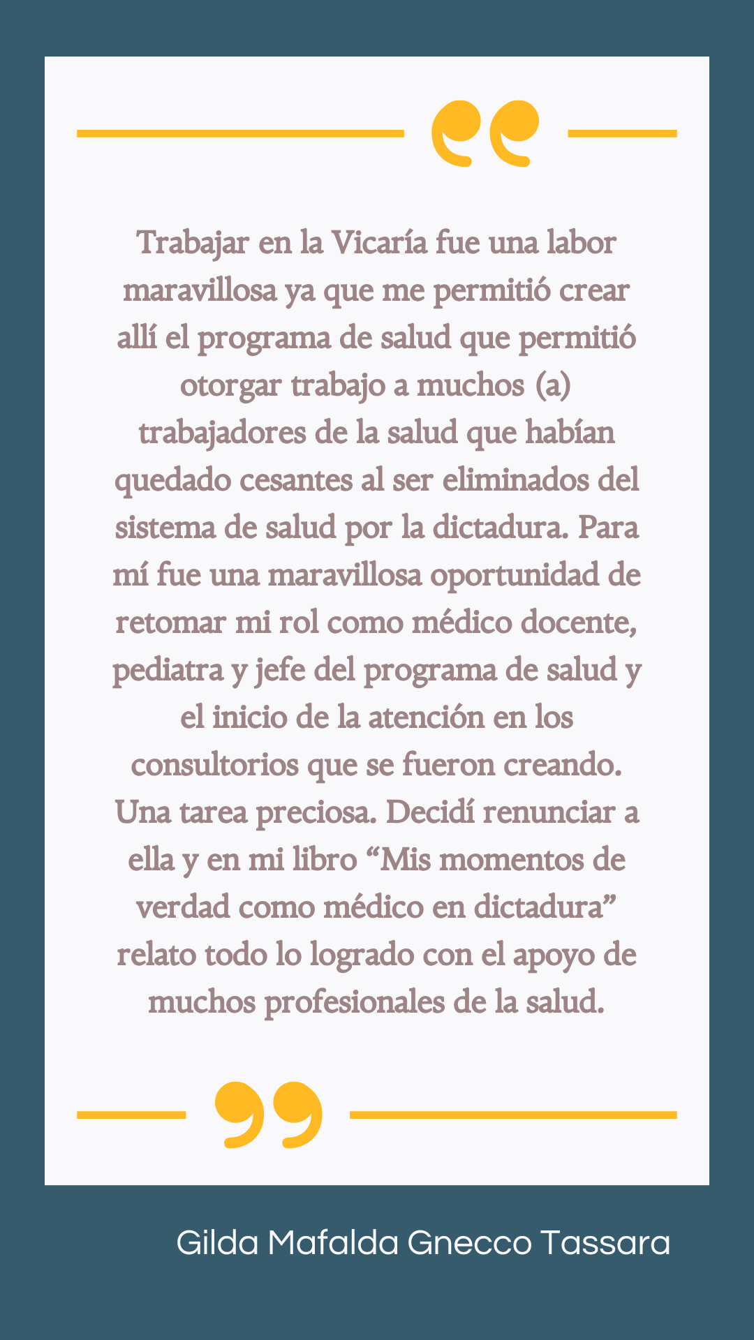 “Trabajar en la Vicaría fue una labor maravillosa ya que me permitió crear allí el programa de salud que permitió otorgar trabajo a muchos (a) trabajadores de la salud que habían quedado cesantes al ser eliminados del sistema de salud por la dictadura. Para mí fue una maravillosa oportunidad de retomar mi rol como médico docente, pediatra y jefe del programa de salud y el inicio de la atención en los consultorios que se fueron creando. Una tarea preciosa. Decidí renunciar a ella y en mi libro “Mis momentos de verdad como médico en dictadura” relato todo lo logrado con el apoyo de muchos profesionales de la salud”.