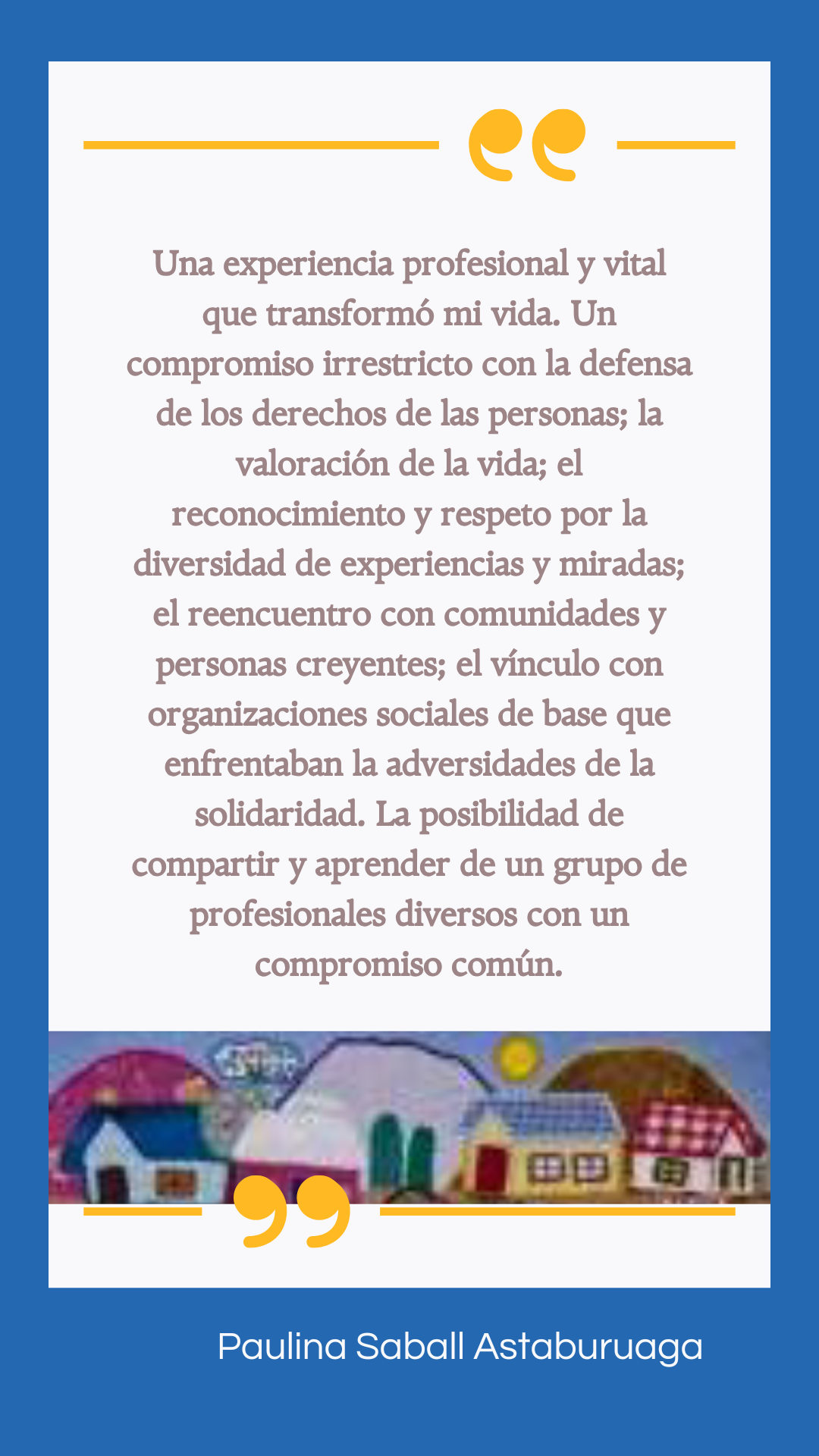 “Una experiencia profesional y vital que transformó mi vida. Un compromiso irrestricto con la defensa de los derechos de las personas; la valoración de la vida; el reconocimiento y respeto por la diversidad de experiencias y miradas; el reencuentro con comunidades y personas creyentes; el vínculo con organizaciones sociales de base que enfrentaban la adversidad desde la solidaridad. La posibilidad de compartir y aprender de un grupo de profesionales diversos con un compromiso común”.